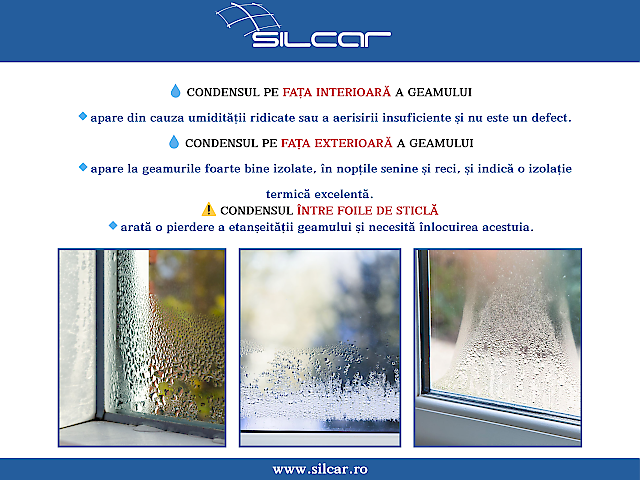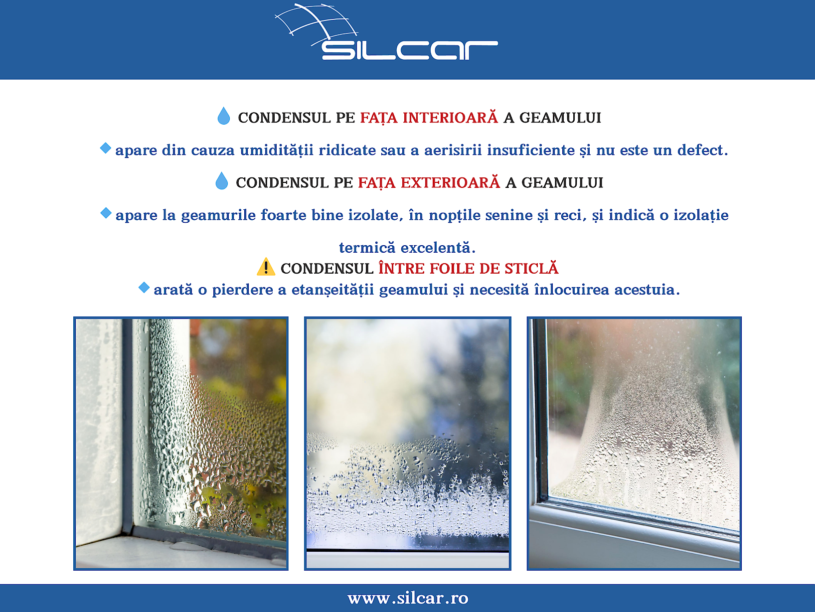 Apariția condensului pe această față nu este un defect al geamului, ci o consecință a umidității interioare.