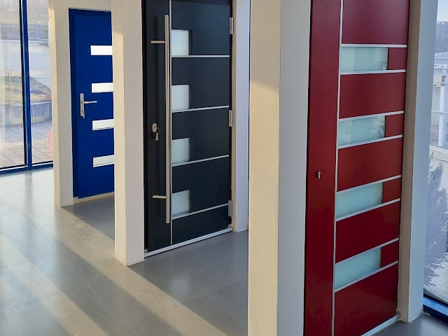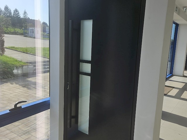 The construction is based on MB-86N aluminium profile systems with thermal insulation, the most advanced door system technology offered by ALUPROF. The door leaf profile is adapted for special infills and is integrated on the interior with the sash.