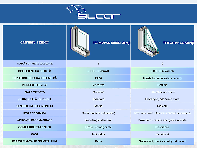 Din punct de vedere tehnic însă, diferența dintre cele două soluții nu este una simplă, legată doar de numărul de foi, ci de performanța energetică măsurabilă a ansamblului de fereastră și de confortul interior pe termen lung.