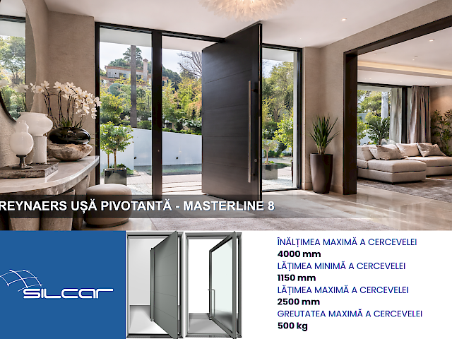 Usile pivotante MasterLine 8 din aluminiu combina un design modern cu performante remarcabile in materie de siguranta, izolare termica si robustete structurala. Acestea reprezinta o optiune ideala pentru intrarile principale, fiind disponibile in versiuni standard, intr-un format XL de mari dimensiuni, precum si intr-o varianta modulara, cu panouri multiple interconectate pentru un efect arhitectural spectaculos.