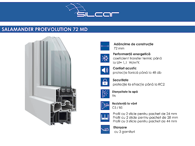 Disponibil intr-o gama variata de culori si finisaje decorative pentru toc si cercevea, sistemul se integreaza cu usurinta in diferite stiluri arhitecturale, de la clasic la modern. Salamander proEvolution 72 MD reprezinta o alegere practica si fiabila pentru proiecte care necesita un raport corect intre performanta, design si cost.)